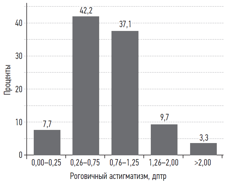 На рис. 2 представлено распределение роговичного астигматизма у пациентов, включенных в исследование.