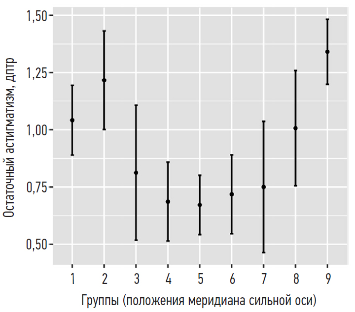 При анализе влияния положения исходной оси сильного меридиана роговицы на остаточный послеоперационный астигматизм (табл. 3) выявлена значимая разница между выборками, выражавшаяся в его меньших значениях в группах 4–6 (прямой астигматизм), и, наоборот, в усилении в группах 1, 2, 8 и 9 (обратный). В среднем разница составляла около 0,3 дптр, что соотносится со средней величиной астигматизма задней поверхности роговицы, равной 0,24 дптр [16].