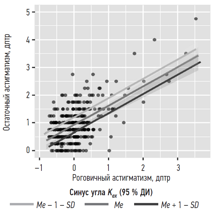 Выполненный регрессионный анализ влияния исходного роговичного астигматизма и расположения оси его сильного меридиана на остаточный цилиндрический компонент клинической рефракции (рис. 4) позволил получить формулу: