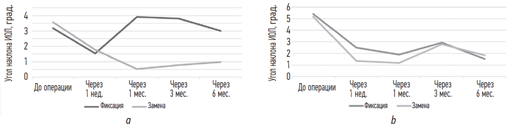 Fig. 5. Changes in Intraocular lens tilt: a — in 180 degrees meridian; b — in 90 degrees meridian