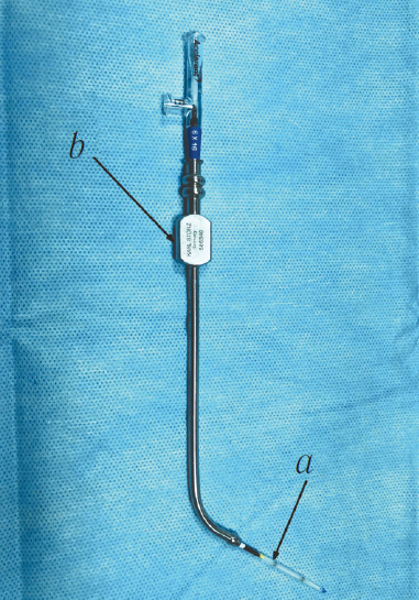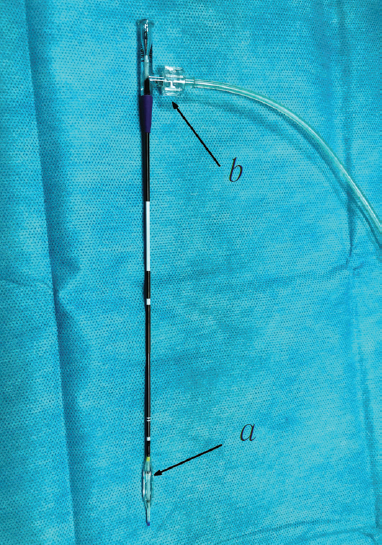 Рис. 3. Внешний вид баллонного катетера, проведённого через канюлю для ирригации: a — баллонный катетер; b — канюля для ирригации