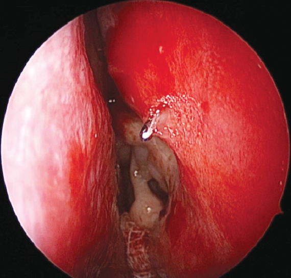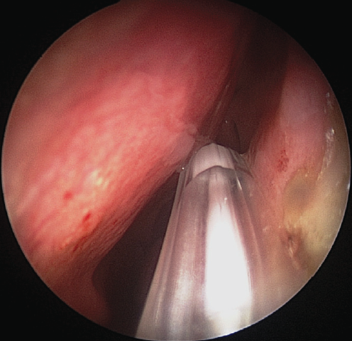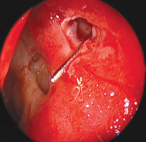 Fig. 5. Endoscopic view of dilated dacryostoma (left nasal cavity) following balloon dacryoplasty. The ostium was probed with Bowman probe