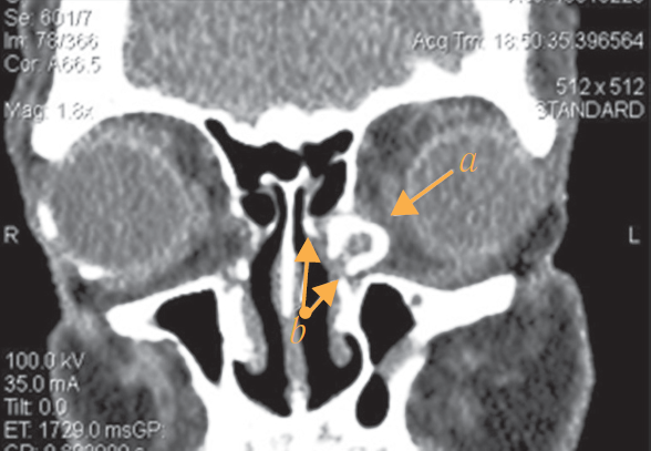 Рис. 6. Мультиспиральная компьютерная томография слёзоотводящих путей с контрастированием, коронарная реконструкция на уровне слёзных мешков: а — заполненный контрастом левый слёзный мешок, b — границы костного «окна»