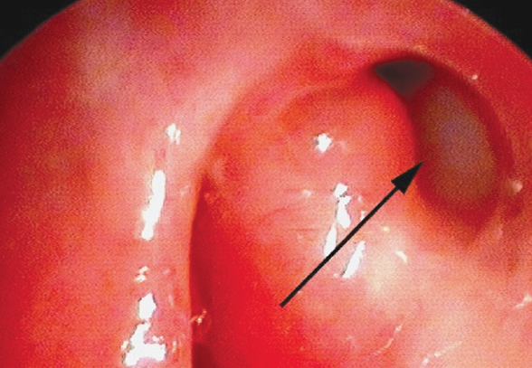 Fig. 7. Endoscopic view of a dacryocystorhinostomy-ostium (left nasal cavity) 6 months after endonasal balloon dacryoplasty; arrow indicates the lumen of the dacryocystorhinostomy-ostium