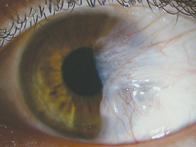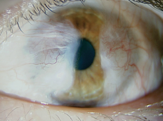 Fig. 2. Left eye (October 2019): recurrent (twice operated on) stage IV pterygium (according to Z.D. Titarenko), degree of activity 3 (according to the D. Tan classification)