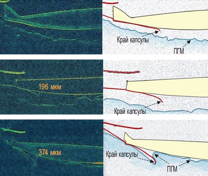 Рис. 1. Оптическая когерентная томограмма. Артифакия, псевдоэксфолиативный синдром, первичный задний капсулорексис. Различные варианты адгезии задней капсулы хрусталика к интраокулярной линзе (тотальная, частичная, по оптическому краю линзы) в раннем послеоперационном периоде (1–2-е сутки). ПГМ — передняя гиалоидная мембрана
