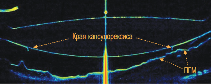 Рис. 2. Оптическая когерентная томограмма. Артифакия, псевдоэксфолиативный синдром, первичный задний капсулорексис. Послеоперационный период — 8 дней. Полная адгезия задней капсулы хрусталика к интраокулярное линзе. ПГМ — передняя гиалоидная мембрана
