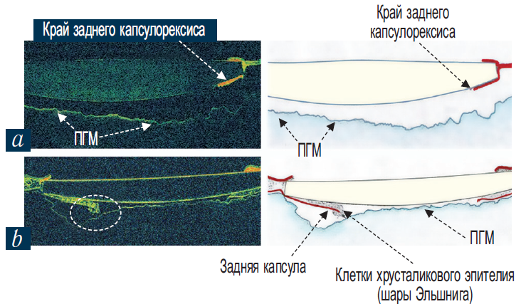 Рис. 3. Оптическая когерентная томограмма. Артифакия, псевдоэксфолиативный синдром, первичный задний капсулорексис. Отдаленный период: а — чистая оптическая зона, деструкция передней гиалоидной мембраны; b — клеточная пролиферация по краю заднего капсулорексиса. ПГМ — передняя гиалоидная мембрана