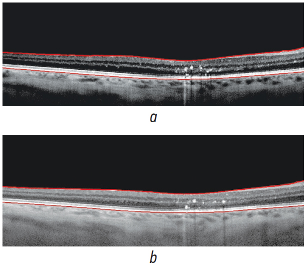Due to the fact that the enlarged diameter of retinal veins during the NAION acute period, is related to the venous outflow impairment caused by the edema of the prelaminary part of the optic nerve, this criterion could be considered as a marker of the optic disc edema, and its dynamic changes — as a response to the carried-out therapy. The diameters of retinal arteries and veins were measured manually on the tomograms obtained before. The evaluation was carried out at 4 vascular arcades at 1.75 mm distance from the optic disc center.