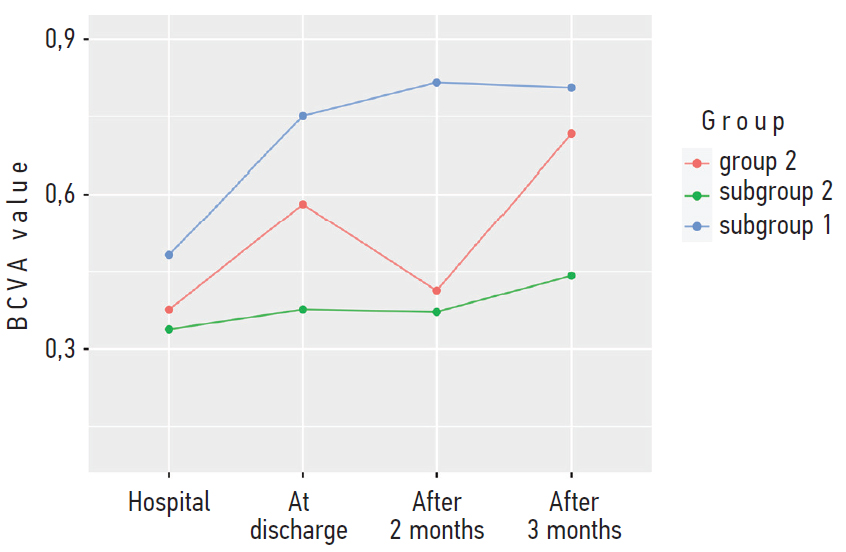 Fig. 5. Dynamics of changes in visual acuity in patients of subgroups 1, 2 and of group 2