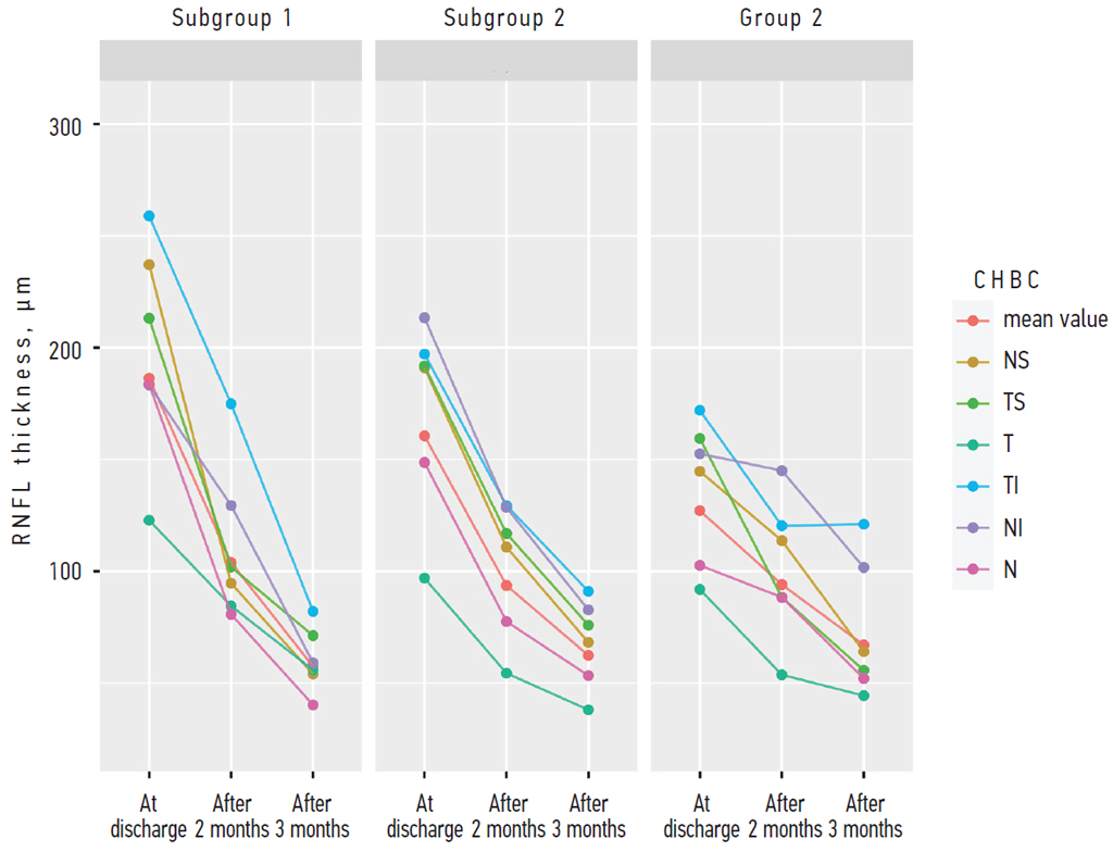 It was revealed that first 5 days from the first signs of the disease may play a critical role in prevention of the additional optic nerve axons death. In timely treatment, BCVA ameliorates significantly more rapidly, and there is no such rapid RNFL thinning as in comparison groups. At the same time, it’s worth noting that the efficacy of 10 daily subconjunctival GCS injections in combination with a single injection into posterior subtenon space of a long-acting GCS does not allow precluding the development of atrophic processes in the optic nerve.