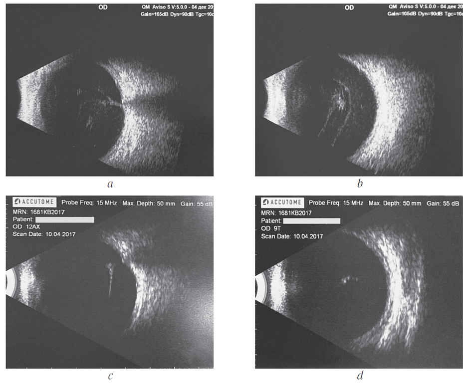 Patient I., female, 55 years old, presented with a sudden loss of vision of her right eye in December 2016. The patient had a history of insulin-dependent type 2 diabetes mellitus. Visual acuity upon presentation was 0.02, no correction possible. B-scan ultrasound examination (a, b) showed severe vitreous hemorrhage. In 1 month after the third monthly intravitreal ranibizumab injection, a complete resolution of vitreous hemorrhage was found (c, d), accompanied by an improvement of visual acuity up to 0.3, no correction possible