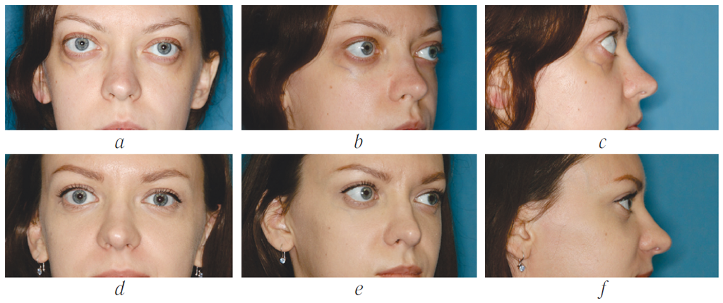 Рис. 1. Внешний вид пациентки до операции (a, b, c) и через 6 месяцев после двусторонней внутренней (жировой) декомпрессии орбиты (d, e, f)
