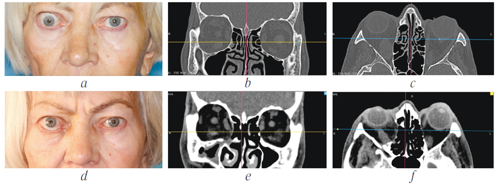 Рис. 2. Внешний вид (a) пациентки и компьютерная томография до операции: b — фронтальная проекция, c — аксиальная проекция; и через 6 месяцев после правосторонней эндоскопической эндоназальной декомпрессии орбиты: d — внешний вид; e — фронтальная проекция, f — аксиальная проекция