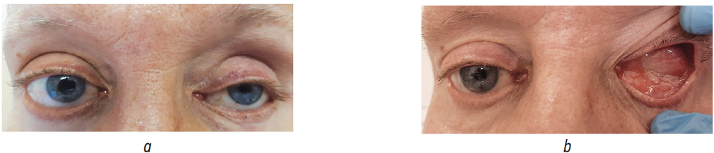 Рис. 1. Пациент, 61 год, 4 года после операции: а — анофтальмический синдром слева, западение косметического протеза, углубление верхней орбито-пальпебральной борозды, птоз верхнего века; b — без протеза, отделяемое в полости, уплощённая передняя поверхность культи, глубокий верхний свод. Состояние после операции с введением имплантата с изменённой геометрией