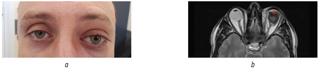 Рис. 2. Пациент, 34 года. 3 года после операции: a — выстояние наружного протеза левого глаза, деформация и растяжение век, растяжение конъюнктивальной полости; b — МРТ-исследование. Стрелкой показана передняя поверхность имплантата с измененной геометрией