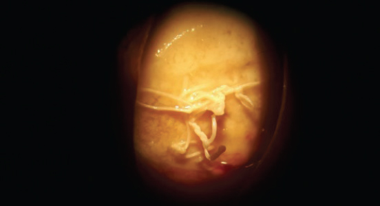 Рис. 4. Шовный материал на передней поверхности культи. Обнажение имплантата (фото-щелевая лампа)