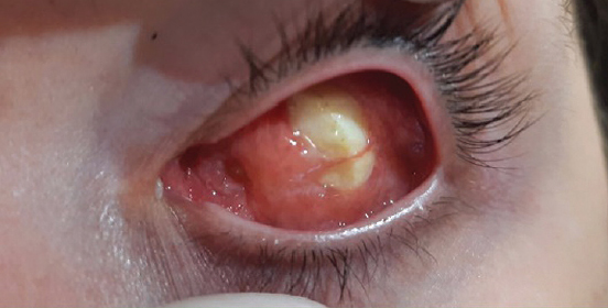 Fig. 5. Patient, 28 y. o. 2 years after surgery. Defect of the epithelium above the surface of the implant with modified geometry, chronic conjunctivitis