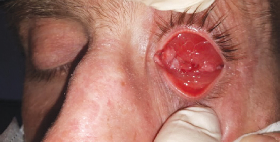 Рис. 6. Пациент, 42 года. 3 года после операции. Грануляции в конъюнктивальной полости анофтальмической орбиты