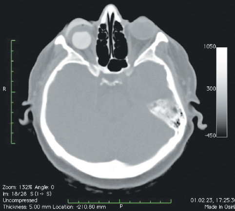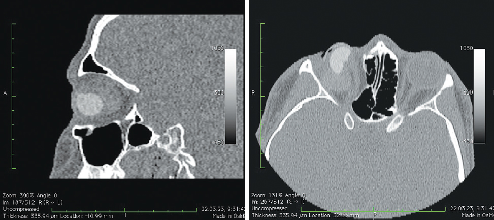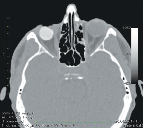 Для визуализации орбитальных структур используется ряд методов, наиболее информативным из которых является мультиспиральная компьютерная томография (МСКТ). С помощью МСКТ глазниц можно полноценно охарактеризовать все структуры орбиты, в том числе установленные имплантаты [14, 15].