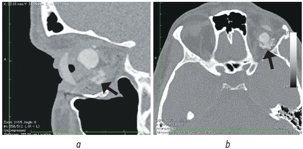 Fig. 10. Patient, 42 y. o. The state after surgery using an implant with modified geometry (a), and multiple fragments of the same material in the tissues of the orbit (b, shown by arrows)