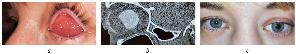 Рис. 11. Пациентка, 33 года: а — общий вид конъюнктивальной полости без протеза. Отёк конъюнктивальной оболочки культи и анофтальмической полости; b — МСКТ-исследование. Гипертрофия мягких тканей кпереди от имплантата с изменённой геометрией. Тонкостенный протез; c — общий вид с протезом. Деформация век, выстояние тонкостенного протеза за счёт гипертрофии и отёка мягких тканей