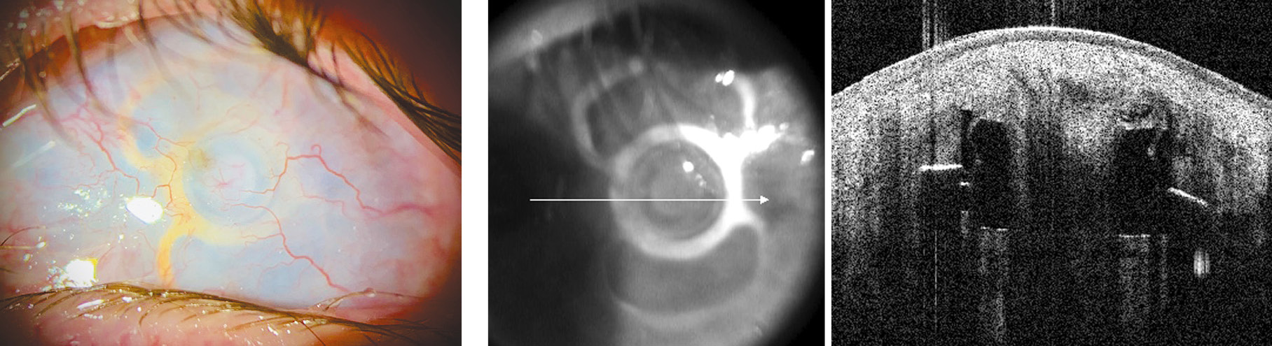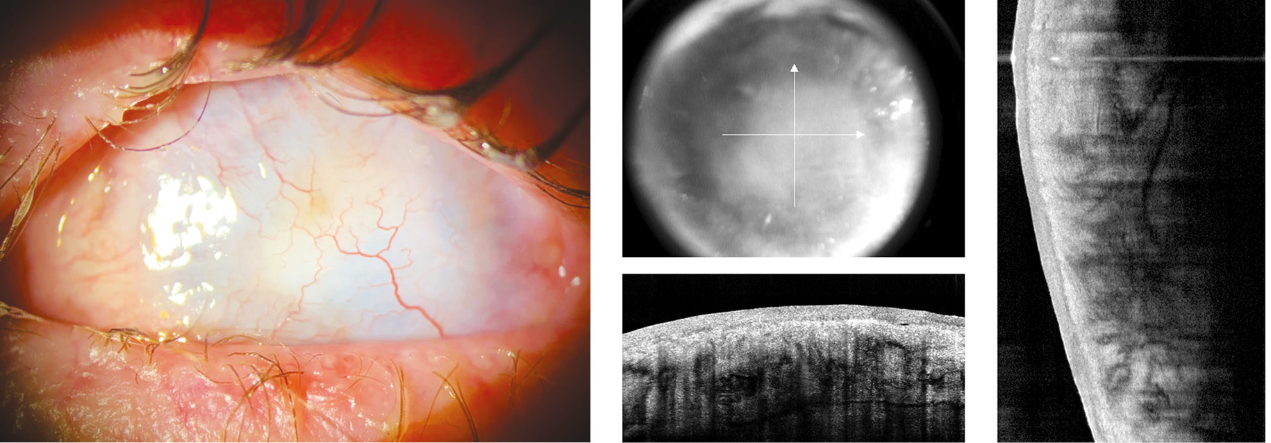 Рис. 3. Результаты первого этапа кератопротезирования (установка опорного элемента кератопротеза Фёдорова – Зуева в толщу васкуляризированного бельма роговицы левого глаза)