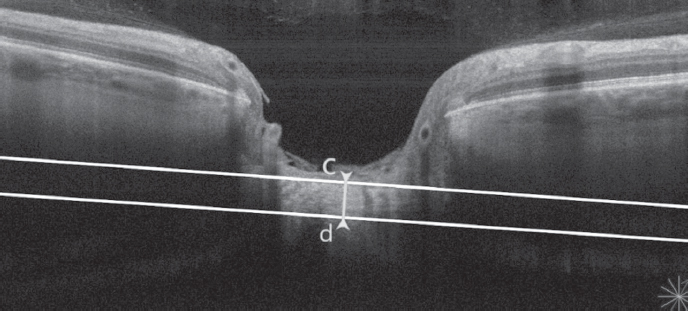 Fig. 2. Lamina cribrosa thickness measurement (c–d) by EDI (Enhanced Depth Imaging) mode of Nidek RS-3000 Advance