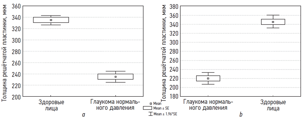 Рис. 5. Средние значения толщины решётчатой пластинки по данным спектральных оптических-когерентных томографов в режиме увеличенной глубины изображения (EDI) при выполнении научно-исследовательской работы (а) и пилотного исследования (b) в двух группах (с указанием 95 % доверительных интервалов)