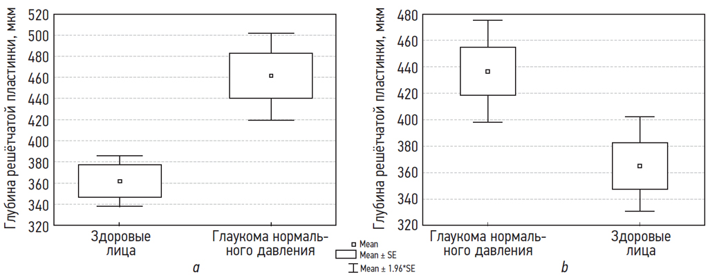 Рис. 6. Средние значения глубины решётчатой пластинки по данным 3D-OCT в режиме увеличенной глубины изображения (EDI) при выполнении научно-исследовательской работы (а) и пилотного исследования (b) в двух группах (с указанием 95 % доверительных интервалов)