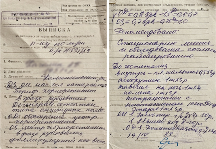 Рис. 1. Осмотр офтальмолога от 19.04.1989. OU — начальная осложненная катаракта, периферический хориоретинит в фазе рубцевания, дегенерация сетчатки типа «ангиоидных полос»