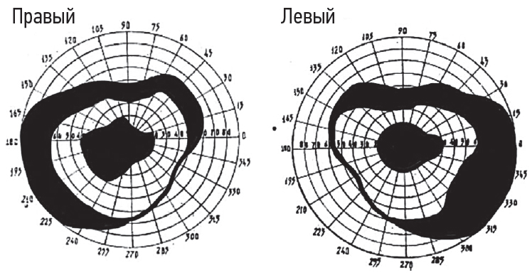 В 2007 г. пациенту проведено электрофизиологическое исследование (ЭФИ), отмечено нарушение проводимости 3-го нейрона. Заключение зрительных вызванных корковых потенциалов (ЗВКП) на OU: активность 3-го нейрона снижена на фоне умеренно увеличенной латентности, характеризует нарушение проводимости зрительного возбуждения по зрительным путям. ВКП с контролем ЗВКП: на OU (+) характеризует нарушение регуляции ВГД. Установлен диагноз глаукомы на обоих глазах. В 2008 г. при повторном ЭФИ — ВКП с контролем ЗВКП: OU (–), получены данные о стабилизации глаукомного процесса. В 2009 г. при исследовании макулярной области (мультифокальная электроретинография, МЭРГ) подтверждено поражение 1–2-го нейрона. МЭРГ в макулярной области: признаки нарушения проведения зрительного возбуждения центральных отделов сетчатки — активность наружных слоёв фоторецепторов (1-й нейрон) и биполярных клеток (2-й нейрон) снижена на OU. В клинике СЗГМУ им. И.И. Мечникова в ходе последней госпитализации в мае 2023 г. в ходе стандартного офтальмологического обследования получены данные: визометрия — OD = 0,1 н/к.; OS = 0,04 sph –1,0D cyl –1,0D Ax 65° = 0,1. ВГД по Маклакову: OU — 20 мм рт. ст. Кинетическая периметрия: OU — неравномерное концентрическое сужение поля зрения, выявлена центральная скотома в пределах окружности от точки фиксации до срединной зоны в 15–30° (рис. 3).