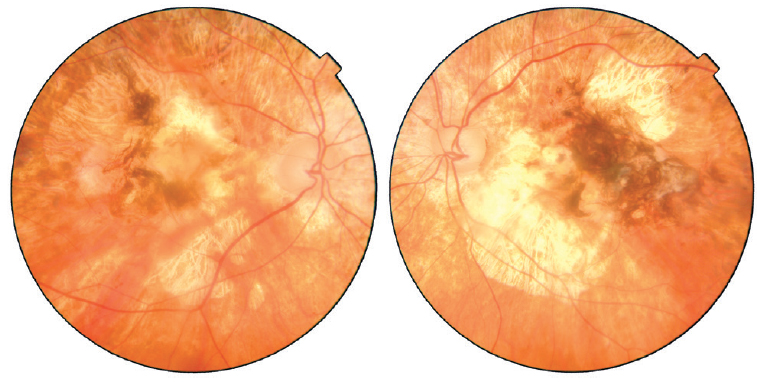 Stage III is characterized by subretinal scarring of the macula, with the development of scotoma and irreversible vision loss. The changes are bilateral, chronic, and progressive [2–4, 35].