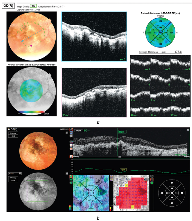 Рис. 6. Разрушенный комплекс «пигментный эпителий – мембрана Бруха», субретинальный фиброз с обширной атрофией пигментного эпителия сетчатки: а — правый глаз; b — левый глаз. Выполнено на TOPCON 3D OCT-1 Maestro2