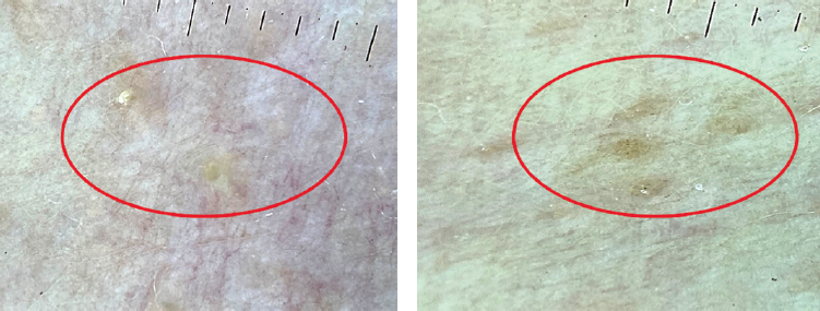 Рис. 7. Фото дерматоскопии пациента от 24.04.2023. Осмотр врача-дерматовенеролога Медико-профилактического центра СЗГМУ им. И.И. Мечникова — канд. мед. наук, доцента А.А. Вашкевич. Обведены единичные мелкие папулы желтовато-бежевого окрашивания и цвета нормальной кожи