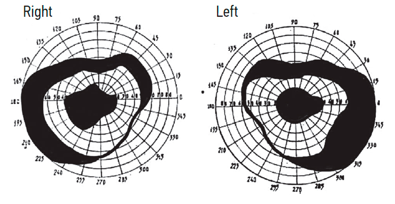 In 2007, electrophysiology testing (EPT) revealed 3rd order neuron conduction abnormality. Visual evoked potential (VEP) test of OU found that the activity of the 3rd order neuron was reduced, and latency was moderately increased. This finding represented abnormal conduction of visual stimulation along the visual pathways. VEP test showed that OU positive evoked potentials represented IOP regulation abnormality. Glaucoma was diagnosed in both eyes. In 2008, repeated EPT and VEP test demonstrated OU negative evoked potentials and glaucoma stabilization. In 2009, macular examination (multifocal electroretinography, mfERG) confirmed damage to the 1st and 2nd order neurons. Macula mfERG revealed signs of abnormal visual conduction in the central retina indicating decreased activity of the outer photoreceptor layers (1st order neuron) and bipolar cells (2nd order neuron) in both eyes. A standard ophthalmic examination during the last hospital stay at the eye hospital of the I.I. Mechnikov North-Western State Medical University in May 2023 provided the following data: OD0.1 non-correctable; OS = 0.04, sph –1.0D cyl –1.0D Ax 65° = 0.1. Bilateral IOP per Maklakov method was 20 mmHg. Kinetic perimetry found bilateral irregular concentric visual field constriction and central scotoma within 15–30° of the fixation point (Fig. 3).