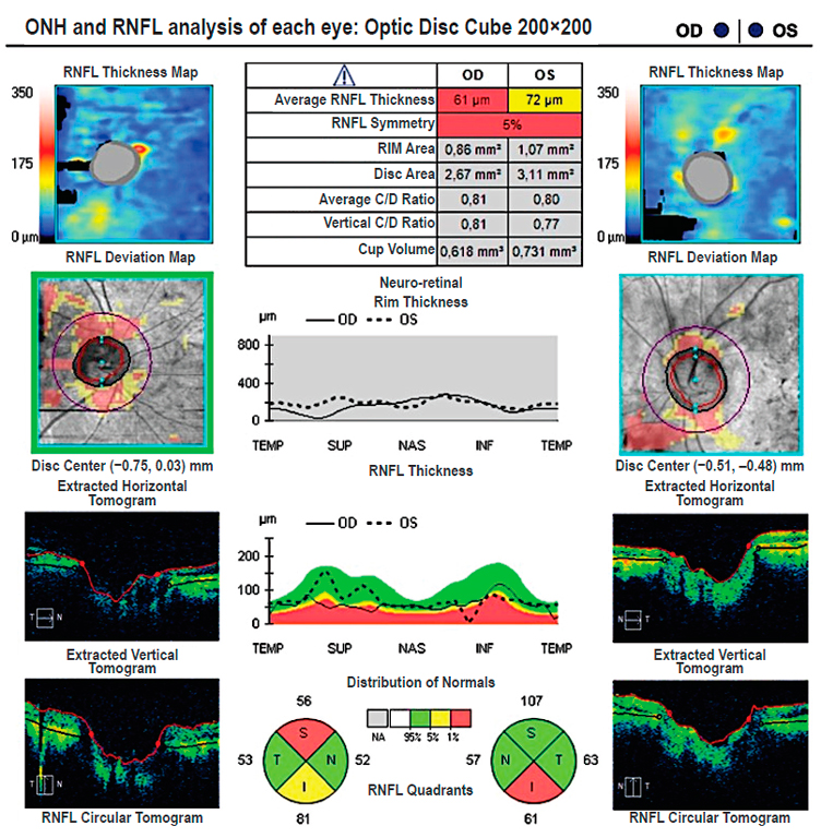 Рис. 5. Анализ ONH и RNFL каждого глаза, Optic Disc Cube 200×200. Расширение экскавации диска зрительного нерва на правом глазу: среднее отношение C/D 0,81; на левом: среднее отношение C/D 0,80. Выполнено на ZEISS CIRRUS 5000