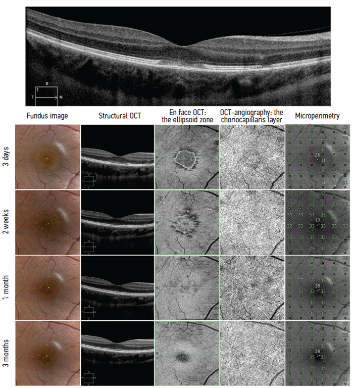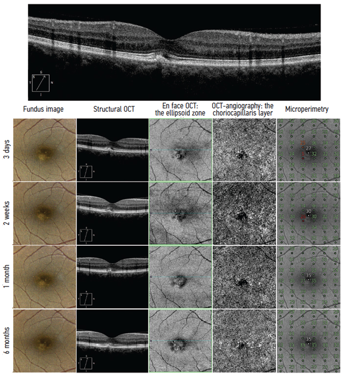At 1-, 3-, and 6-months follow-up visits, the complaints remained the same, although the intensity of the spot in the visual field decreased; the best corrected visual acuity was restored to 1.0 at 1 month, and the structural OCT sections showed that the defect persisted, the ellipsoid zone remained partially damaged, and the en face area of its lesion was unchanged (Fig. 2).