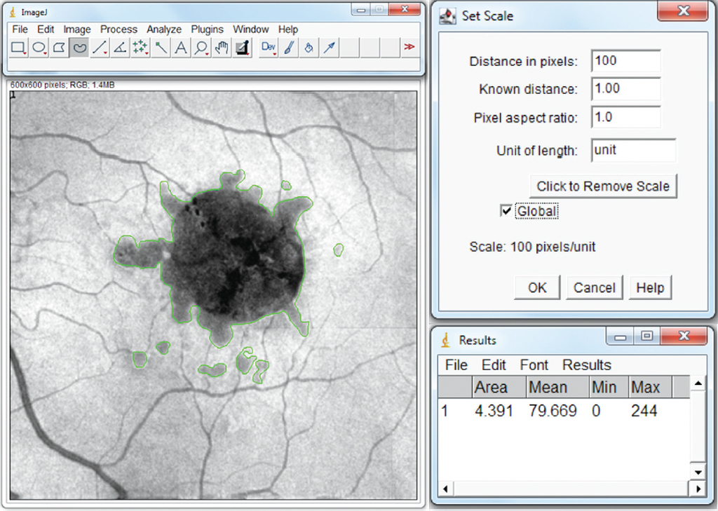 Рис. 1. Репрезентативный пример вычисления площади друзеноидной отслойки пигментного эпителия сетчатки у пациента с сухой формой возрастной макулярной дегенерации. Структурная En Face-проекция скана протокола «HD Angio Retina 6 mm»