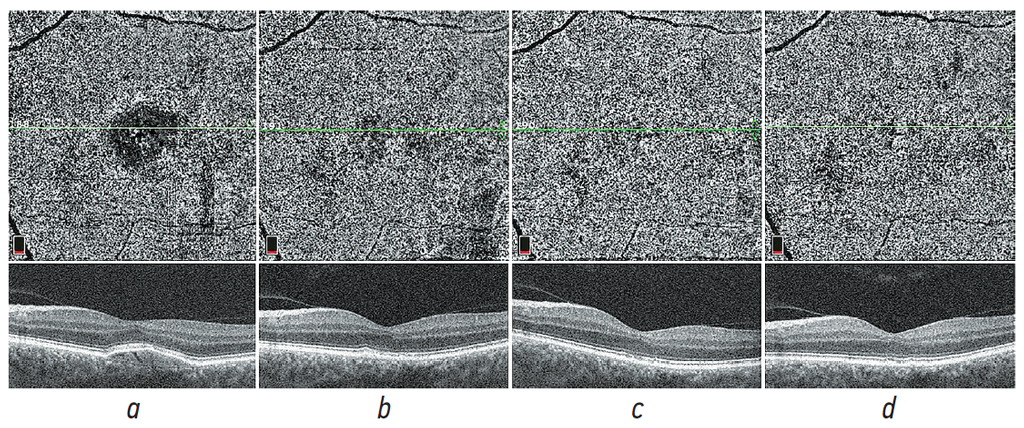 Рис. 4. Пример динамики структурно-анатомических изменений при применении каскадной плазмофильтрации у пациентов с сухой формой возрастной макулярной дегенерации по данным ОКТ и ОКТ-А в ходе исследования: а — начало наблюдения; b — через 1 мес.; с — 6 мес.; d — 12 мес.