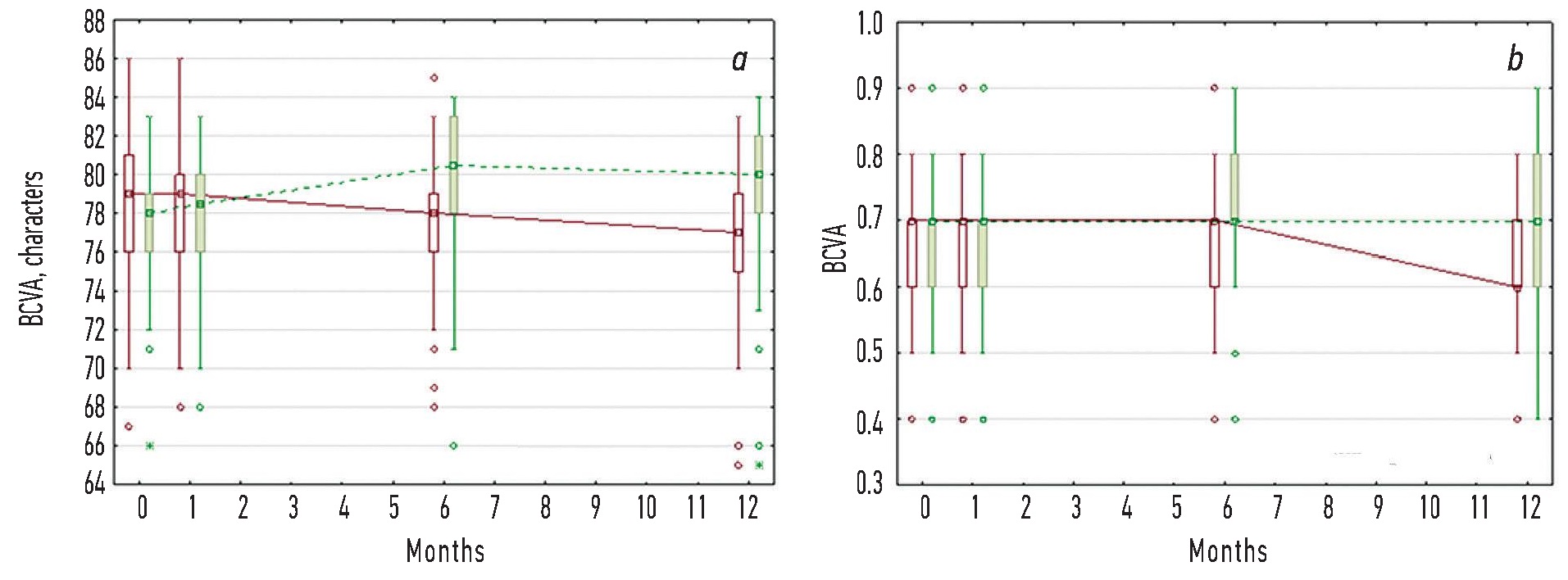 The analysis of changes in visual acuity (Table 5, Fig. 7) showed that after the CF course (after 1 month of follow-up), the study group had a statistically significant increase in BCVA (from 78.0 to 80.5 letters, p = 0.04) at Month 6. The improvement was maintained up to Month 12 and interpreted as disease stabilization. A significant decrease in BCVA from Month 6 to and including Month 12 was reported (from 79.0 to 77.0 letters, p < 0.01) in the control group. These changes were confirmed by a significant difference in ETDRS letters between the study and control groups at Month 6 (80.5 and 78.0 letters, p = 0.02) and Month 12 (80.0 and 77.0 letters, p < 0.01).