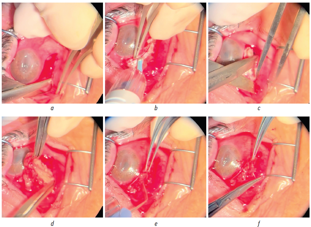 Рис. 1. Этапы операции: a — отсечение и отсепаровка конъюнктивы к своду; b — формирование склеро-роговичного тоннеля; c — вскрытие тарзоорбитальной фасции; d — выделение жирового пакета; e — перемещение клетчатки в сублимбальное пространство; f — фиксация клетчатки П-образными швами