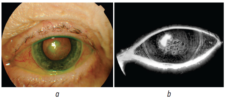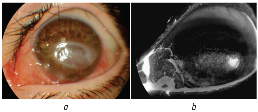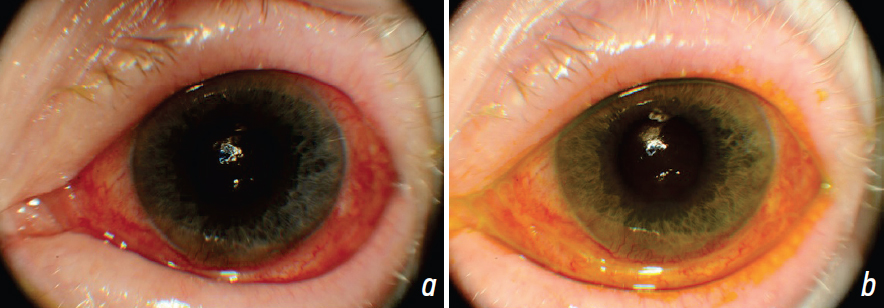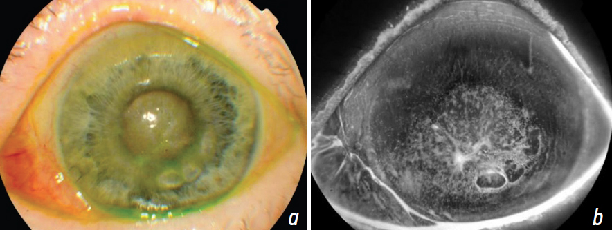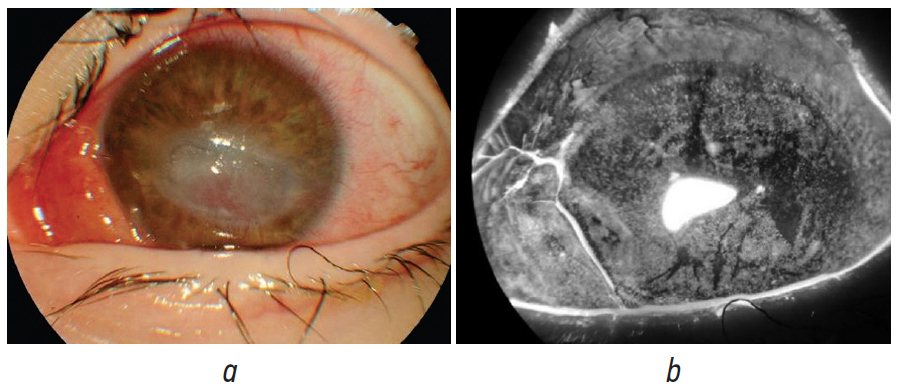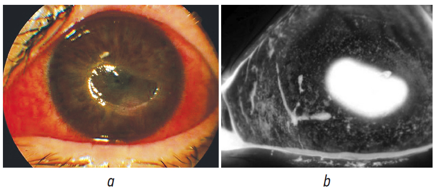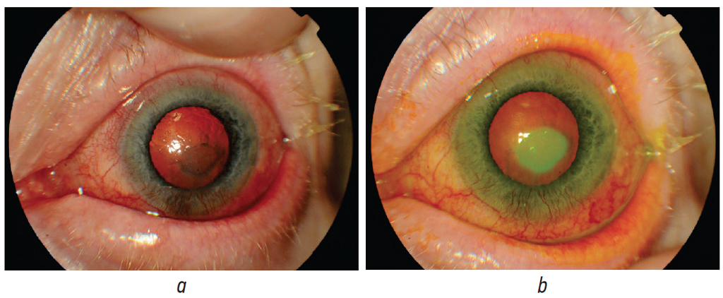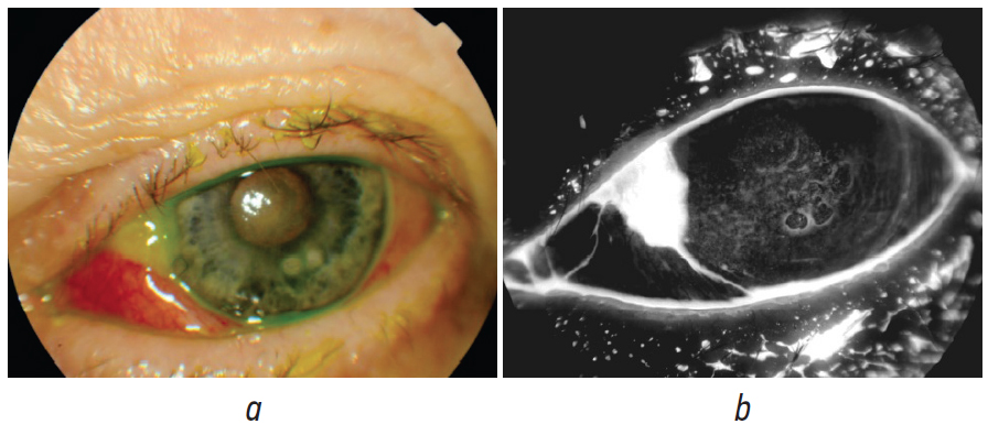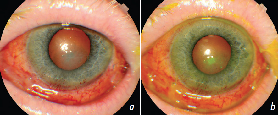 Рис. 2. Фотография переднего отрезка глаза пациентки О. с применением флуоресцеина: a — в цветном режиме; b — в режиме флуоресценции