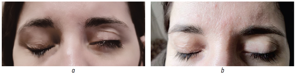 Рис. 12. Пациентка Д.: a — состояние до латерального подвешивания тарзальной пластинки в сочетании с рецессией апоневроза леватора верхнего века; b — состояние после латерального подвешивания тарзальной пластинки в сочетании с рецессией апоневроза леватора верхнего века