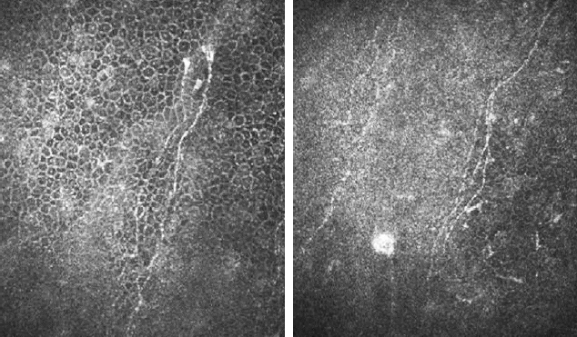 During HRT with the corneal module thickening of nerve fibers is visualized (Fig. 19).