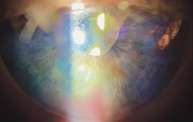 Рис. 3. Трансиллюминация радужки в зоне её контакта с гаптическим элементом интраокулярной линзы, микрогифема