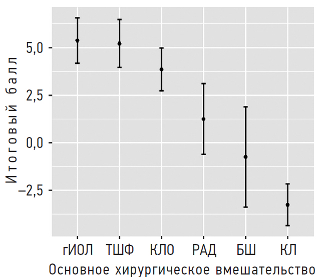 Fig. 1. Dependence of final score due to surgical approach; R2 = 0.648; p < 0.001. гИОЛ — hydrophobic IOL exchange on hydrophilic model with its transscleral fixation; ТШФ — transscleral fixation of native IOL; КЛО — hydrophobic IOL exchange on polymethylmethacrylate iris-claw IOL; РАД — iris-fixated IOLs; БШ — immobilization with scleral bandage sutures; КЛ — conservative treatment