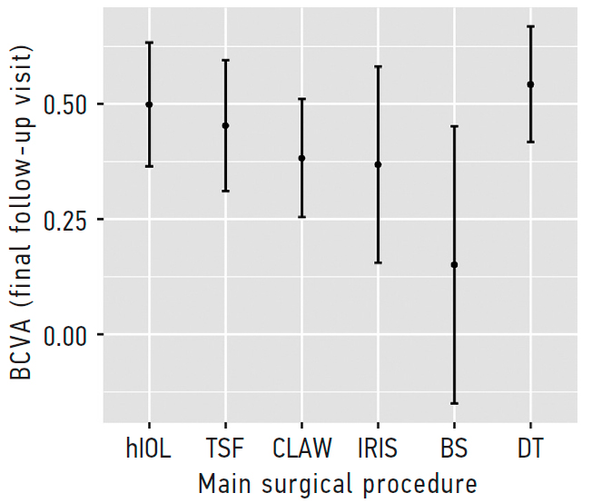 Table 3 provides a comparison of the main surgical procedures by final score and achieved BCVA.