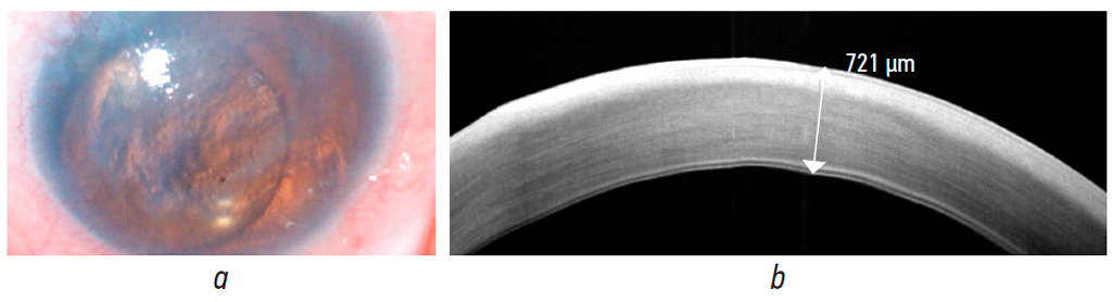 Fig. 7. Clinical case No. 2, 3 months after the femtosecond laser-assisted posterior automated lamellar keratoplasty with a banded stromal flap: a, photo of the anterior segment of the eye, the cornea is transparent, the remnants of the capsular bag are visible; b, OCT of the cornea, the central thickness of the cornea is 605 µm, endothelial graft’s thickness is 76 µm