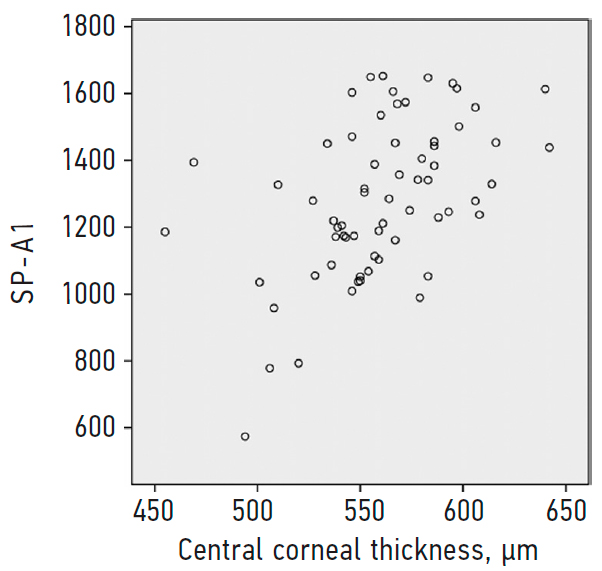 Рис. 1. Зависимость параметра жёсткости фиброзной оболочки глазного яблока SP-A1 от центральной толщины роговицы при первичной открытоугольной глаукоме